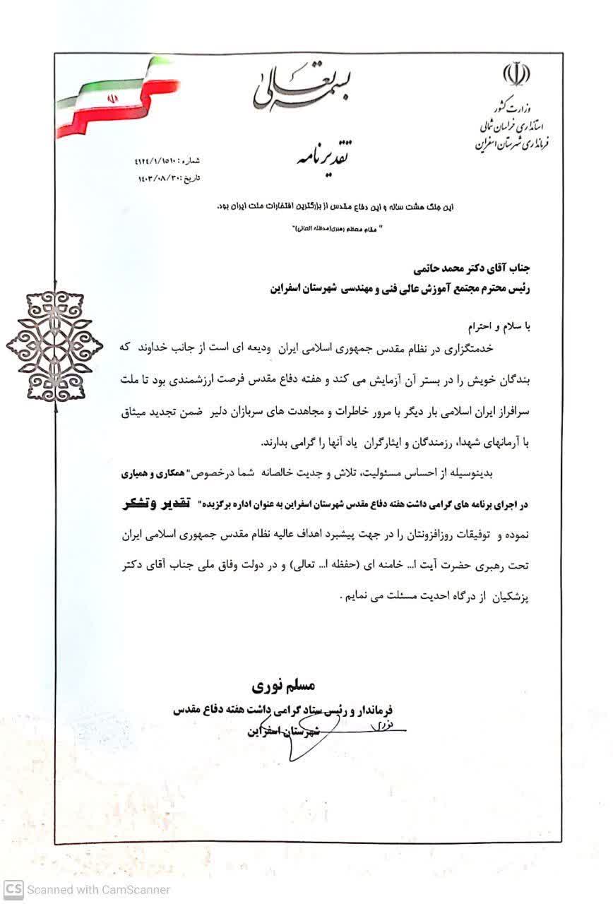 تقدیر و تشکر فرماندار شهرستان اسفراین از مجتمع آموزش عالی فنی ومهندسی اسفراین