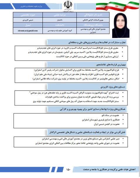 در صفحه ۱۵۰ این کتاب ضمن معرفی دکتر مهری السادات اکرامی کاخکی، سوابق این پژوهشگر در حوزههای تجارب مشارکت در فعالیتها و برنامهریزیهای ملی و منطقهای، مهمترین قراردادهای تقاضامحور، دستاوردهای ویژه کاربردی، و همکاریهای ویژه با نهادها و صنایع برای بهبود بهرهورى و کارآیی ارائه شده است.