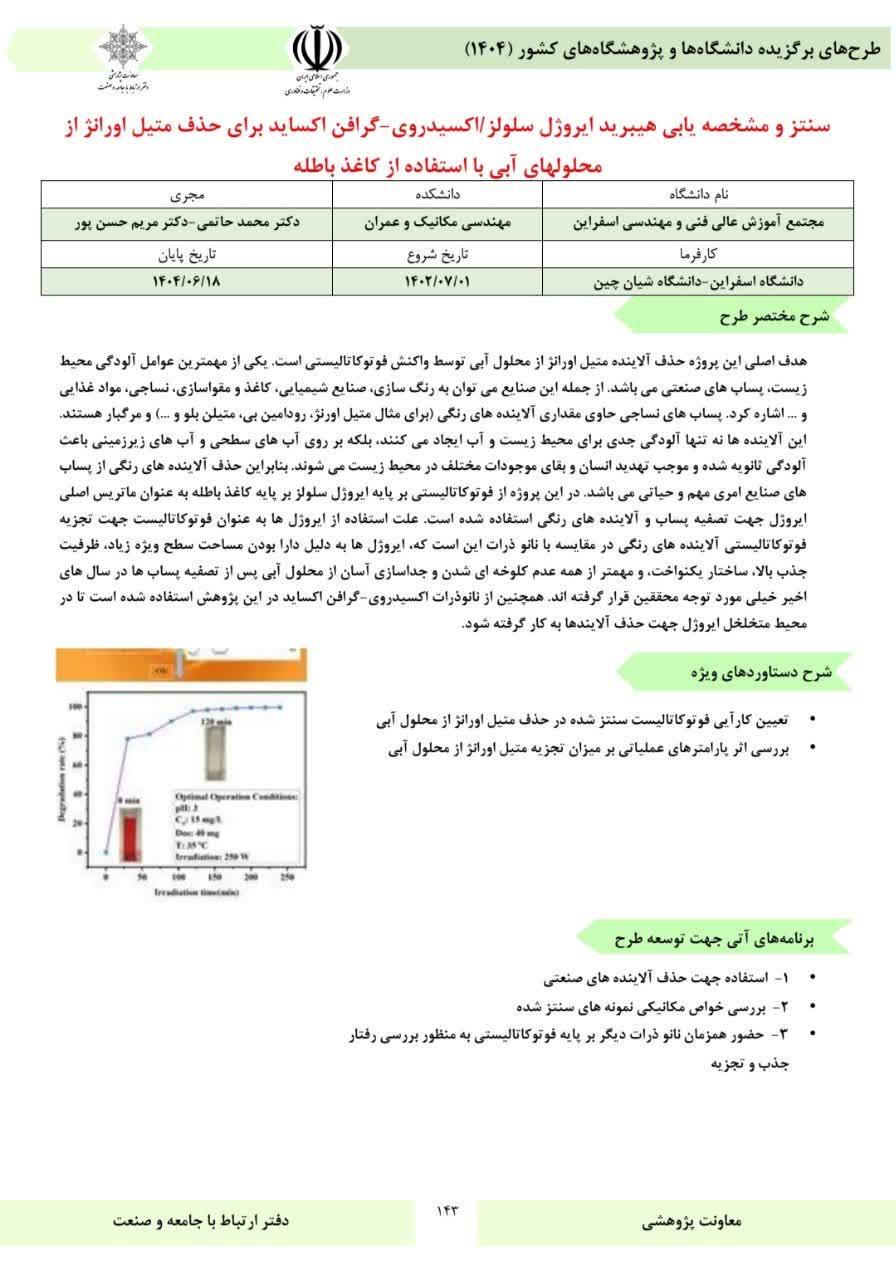 در این کتاب، گزارشی از طرح پژوهشی بینالمللی (کارفرما دانشگاه شیان چین) با عنوان «سنتز و مشخصهیابی هیبرید آیروژل سلولز» که توسط دکتر محمد حاتمی، دانشیار این مجتمع آموزش عالی انجام شده است، به عنوان یکی از طرحهای صنعتی برگزیده در صفحه ۱۴۳ معرفی و تشریح شده است.