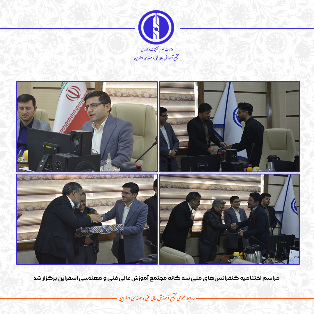 به گزارش روابط عمومی مجتمع آموزش عالی فنی و مهندسی اسفراین، مراسم اختتامیه کنفرانسهای ملی سه گانه مجتمع آموزش عالی فنی و مهندسی اسفراین برگزار شد، در این مراسم که با حضور هیات رئیسه مجتمع، معاونت مهندسی و مدیر روابط عمومی مجتمع صنعتی اسفراین، اعضا هیات علمی و دانشجویان مجتمع برگزار شد، از عوامل اجرایی کنفرانس و مقالات برگزیده تقدیر بعمل آمد. همچنین از مجتمع صنعتی اسفراین به عنوان غرفه برتر در نمایشگاه صنعت و فناوری تقدیر شد.