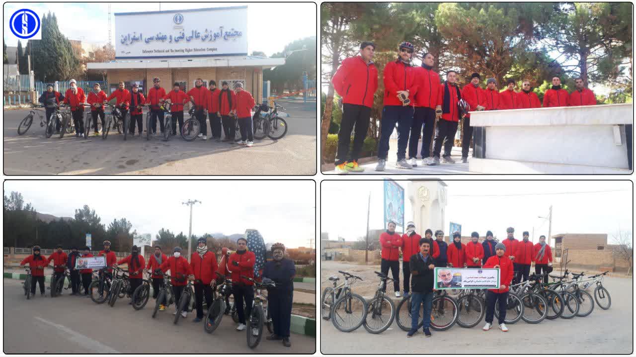 به گزارش روابط عمومی مجتمع آموزش عالی فنی و مهندسی اسفراین، به مناسبت گرامیداشت سالروز شهادت شهید قدس، سردار حاج قاسم سلیمانی و هفته مقاومت همایش دوچرخه سواری کارکنان مجتمع آموزش عالی فنی و مهندسی اسفراین برگزار شد. در این همایش که با حضور ریاست، مدیران و کارکنان مجتمع امروز جمعه ۸ دی ماه ساعت ۷ صبح شروع شد، دوچرخه سواران مسیر پارک مدافعان سلامت تا گلزار شهدای گمنام مجتمع، به طول ۳۵ کیلومتر را رکاب زدند.