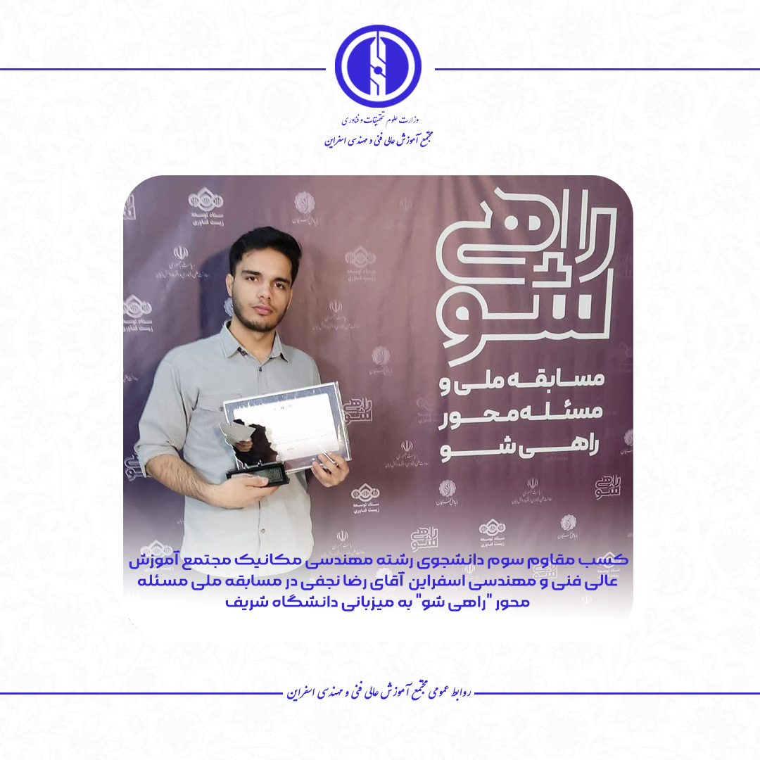 به گزارش روابط عمومی مجتمع آموزش عالی فنی و مهندسی اسفراین، دانشجوی رشته مهندسی مکانیک مجتمع آموزش عالی فنی و مهندسی اسفراین آقای رضا نجفی در مسابقه ملی مسئله محور "راهی شو" به میزبانی دانشگاه شریف، موفق به کسب مقاوم سوم گردید.