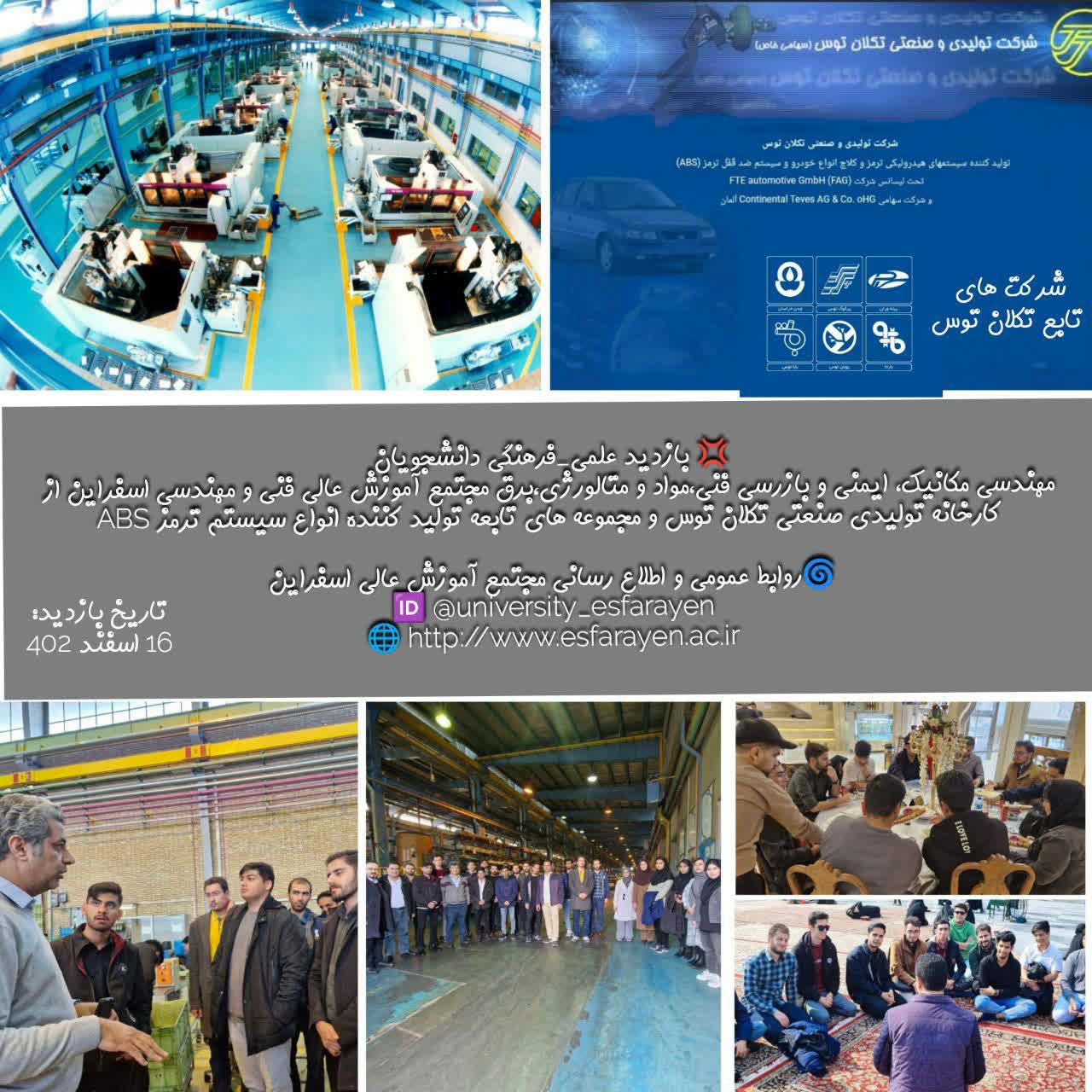 بازدید علمی_ فرهنگی دانشجویان برگزیده مهندسی مکانیک، ایمنی ، مواد و متالورژی،برق مجتمع آموزش عالی فنی و مهندسی اسفراین از مجموعه صنعتی کارخانه جات تکلان توس و مجموعه های تابعه تولید کننده انواع سیستم ترمز ABS