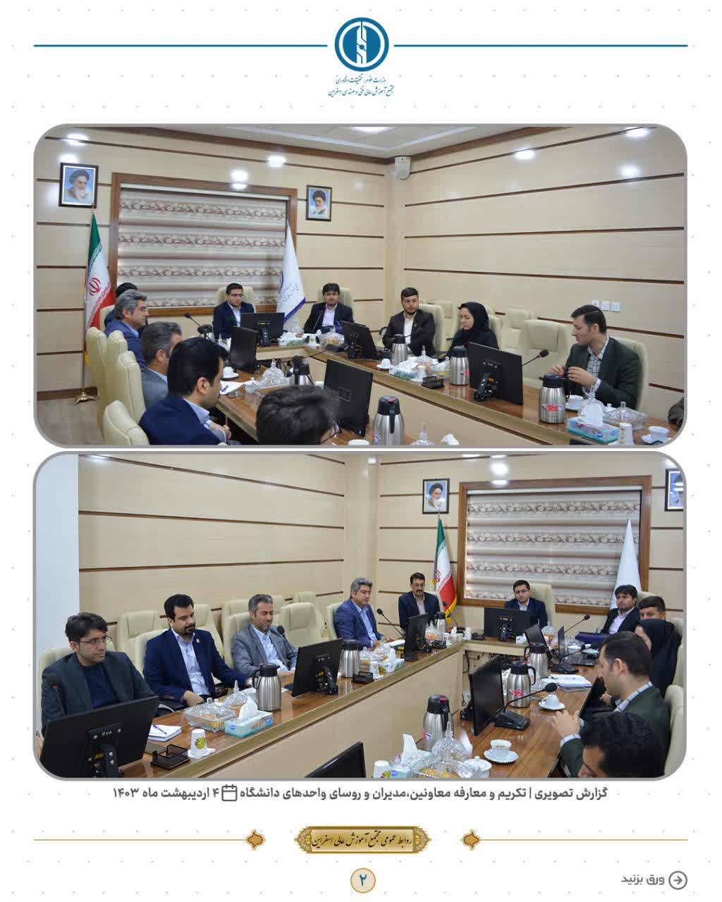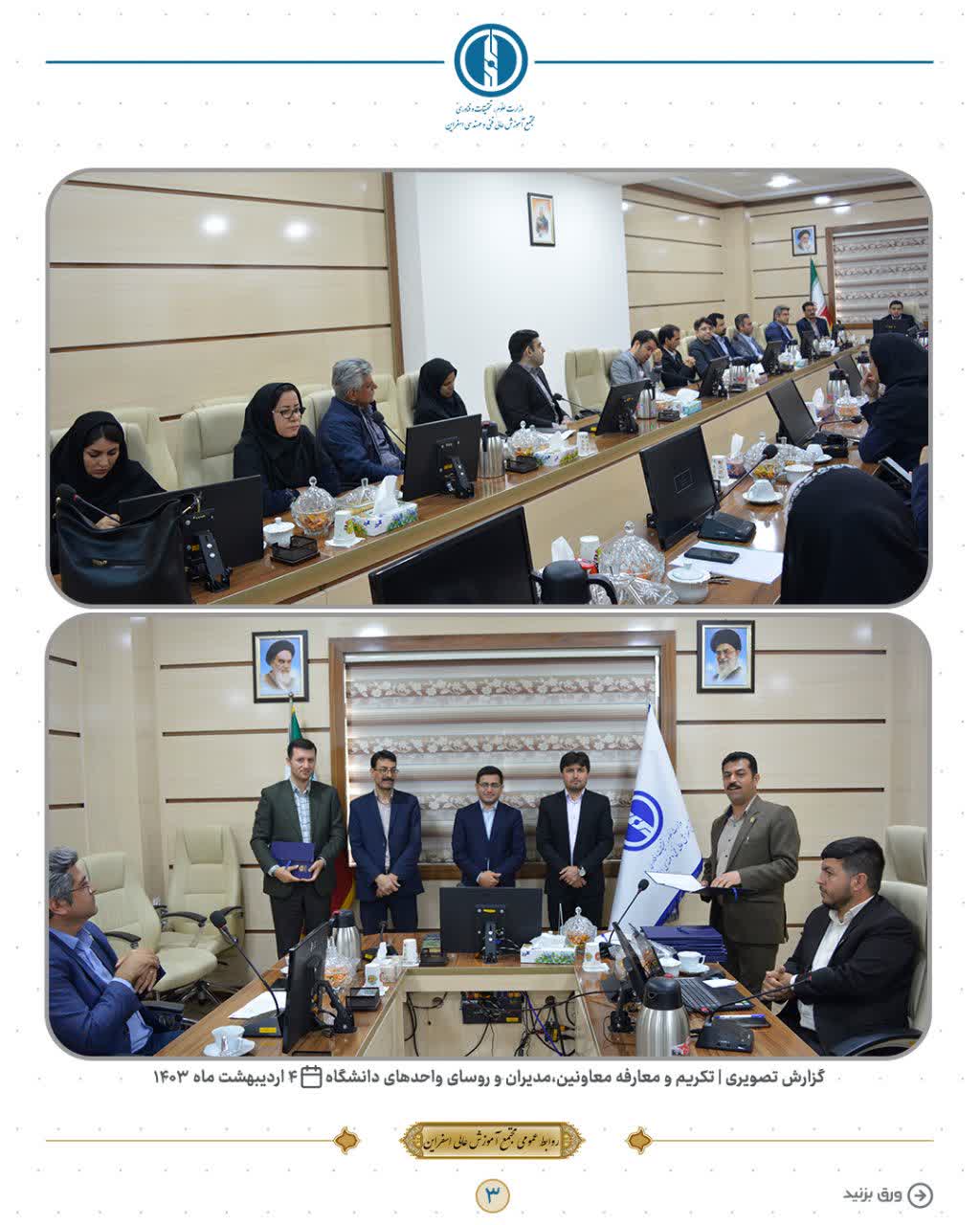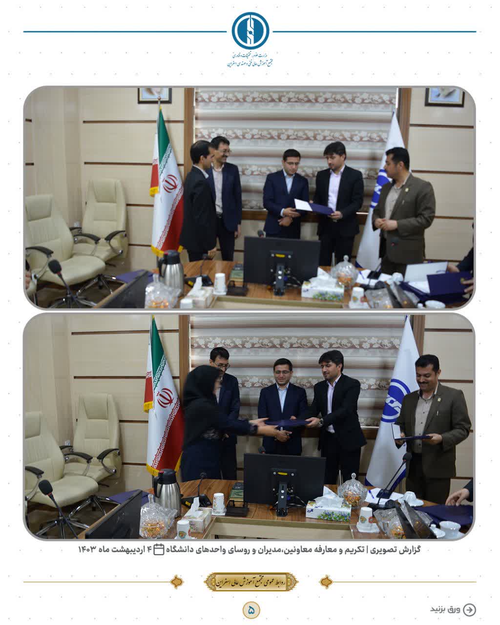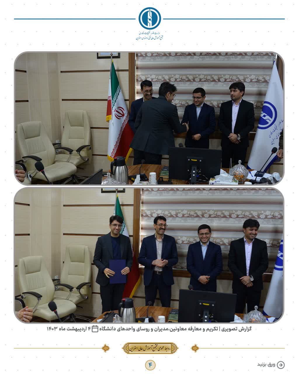 تقدیر و قدردانی از زحمات دکتر مهدی احمدی و دکتر فرهنگ پدیداران مقدم درمدت تصدی مسئولیت مدیریت امور پژوهش و فناوری و مدیریت آموزش و تحصیلات تکمیلی، و معارفه دکتر علی قربانیان و دکتر مصطفی طهری به عنوان مدیران این واحدها از دیگر بخشهای این برنامه بود.