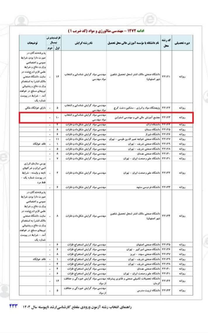 رشتههای جذب شده در جهت ماموریت منطقهای مجتمع و متناسب با صنایع (فولاد) و معادن (سرب و روی) شهرستان میباشد.