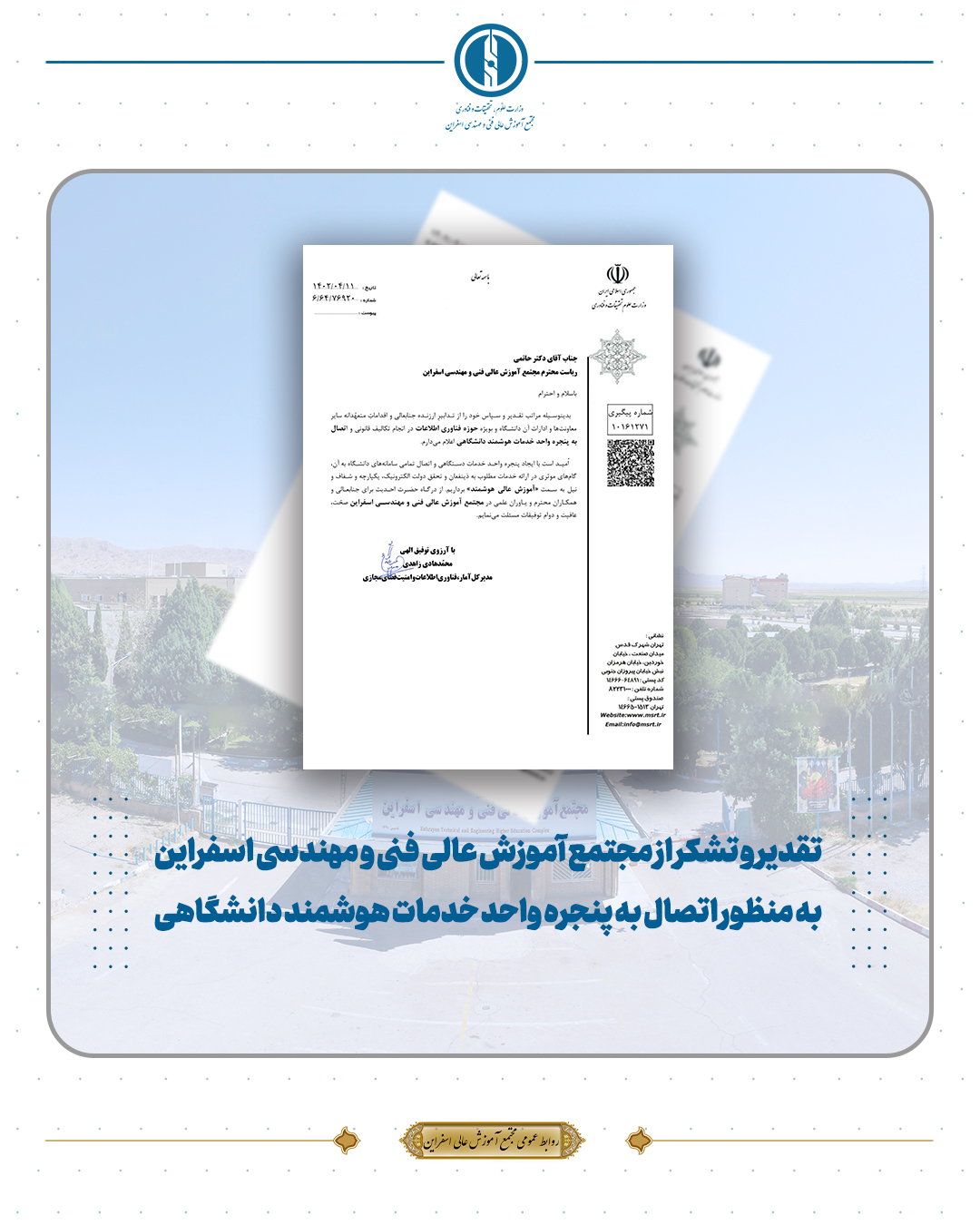 گفتنی است هم اکنون مجتمع آموزش عالی فنی و مهندسی اسفراین نیز در لیست ارائه دهندگان خدمات الکترونیکی در قالب پنجره واحد هوشمند است و برای دریافت این خدمات میتوانید از پنجره ملی خدمات دولت هوشمند به آدرس my.gov.ir مراجعه کنید.
