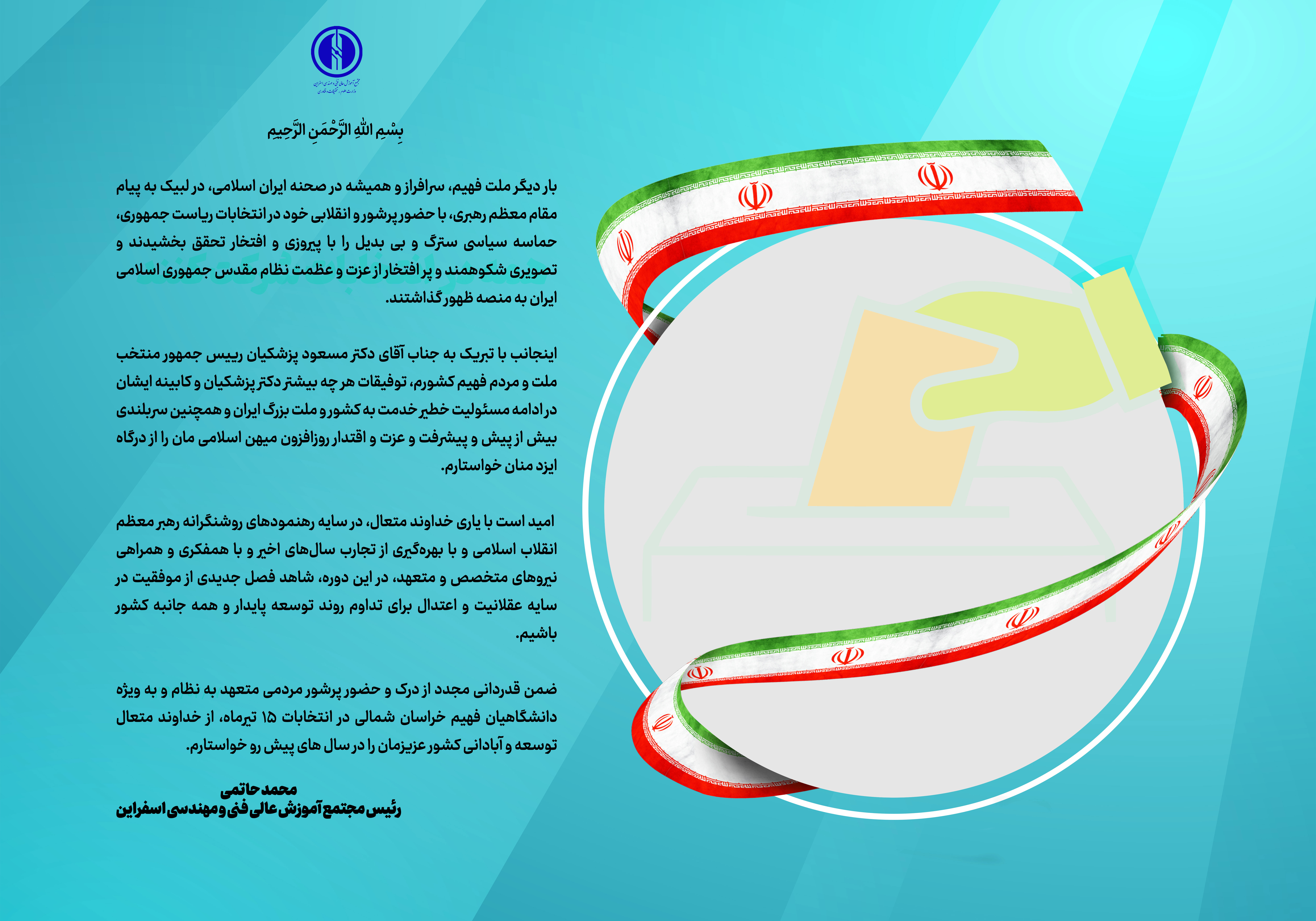 پیام قدردانی دکتر محمد حاتمی ریاست مجتمع آموزش عالی فنی و مهندسی اسفراین از حضور پرشور ملت شریف ایران در چهاردهمین دوره انتخابات ریاست جمهوری و تبریک به رئیس جمهور منتخب ایران اسلامی