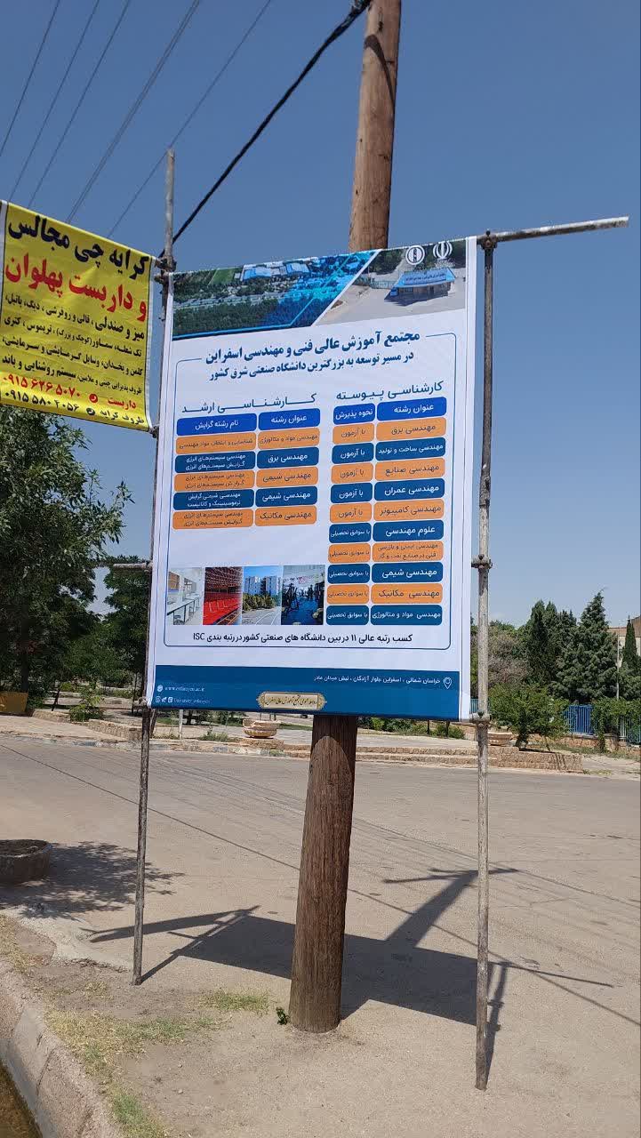 به گزارش روابط عمومی مجتمع آموزش عالی فنی و مهندسی اسفراین، در حاشیه آغاز نوبت دوم آزمون کنکور سراسری در مجتمع آموزش عالی فنی و مهندسی اسفراین، با تأکید بر اهمیت بومیگزینی و تنوع رشتههای مجتمع، به همت مدیریت امور آموزشی و تحصیلات تکمیلی با ایجاد غرفه و نصب بنرهایی در مجتمع به جهت معرفی امکانات، دستاوردها، توانمندیها، رشتههای مجتمع و راهنمایی داوطلبان و خانوادههای ایشان در محوطه مجتمع انجام پذیرفت.