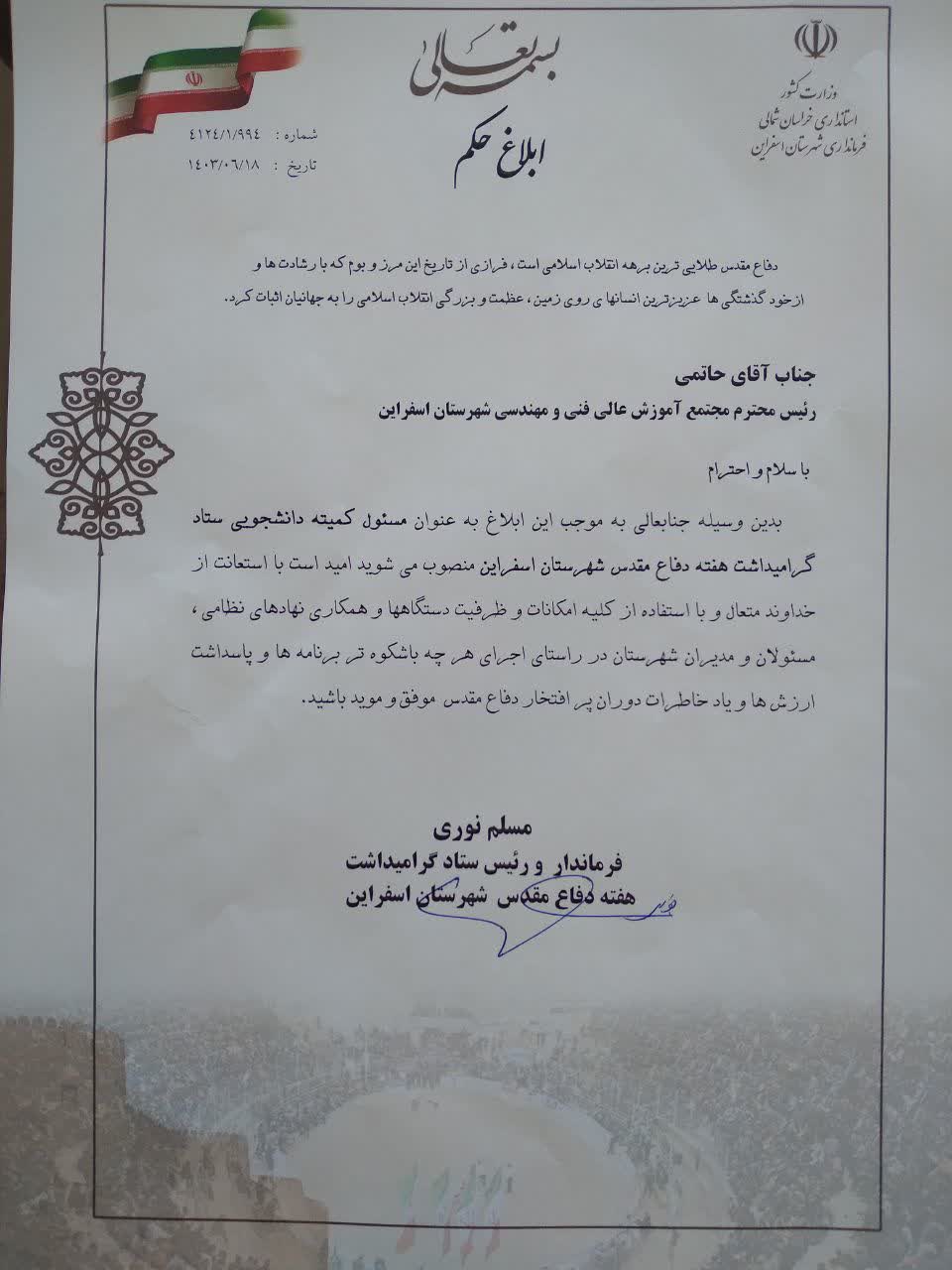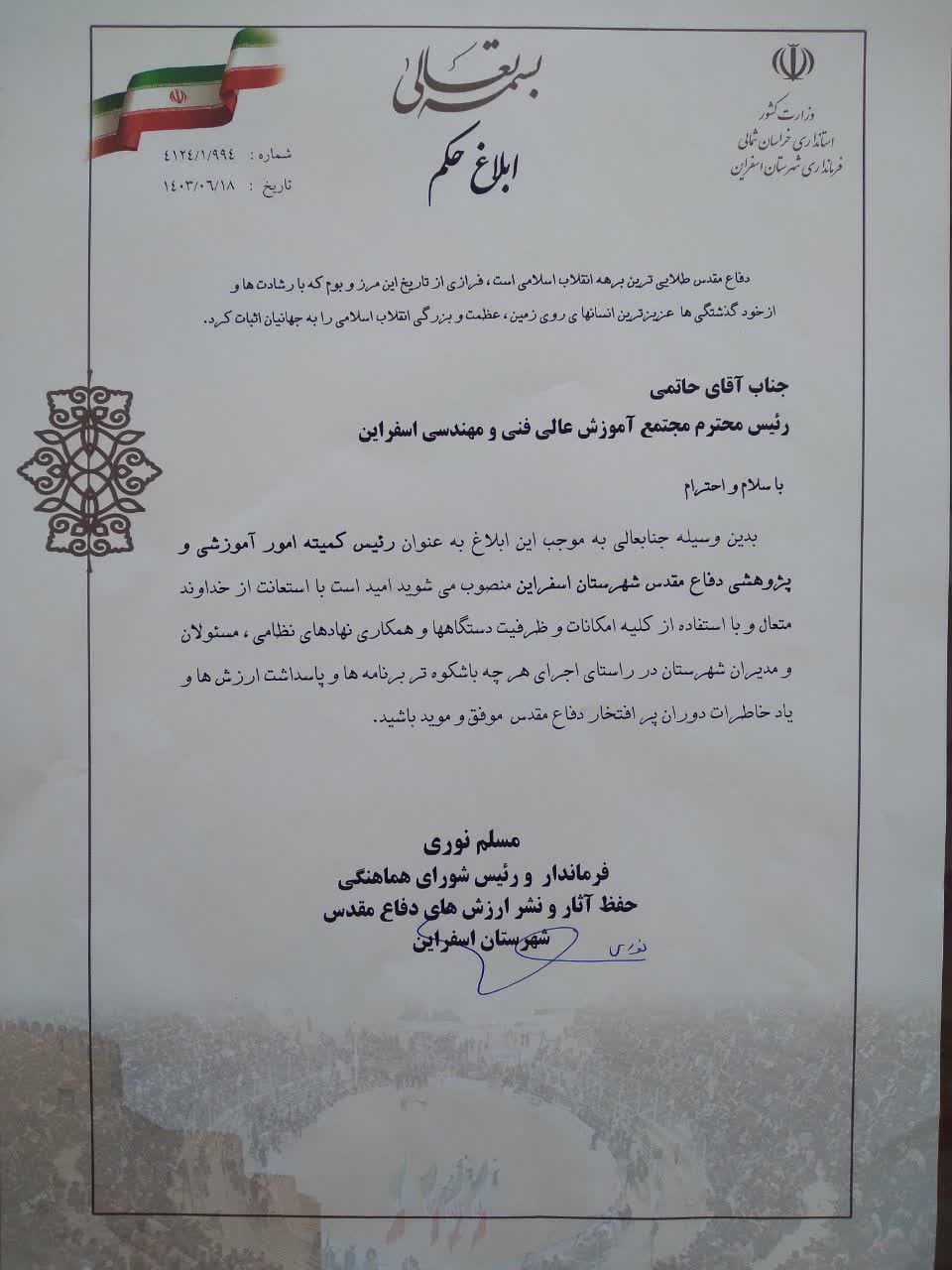 به گزارش روابط عمومی مجتمع آموزش عالی فنی و مهندسی اسفراین، دکتر مسلم نوری، فرماندار شهرستان اسفراین طی احکام جداگانه ای دکتر محمد حاتمی رئیس مجتمع آموزش عالی فنی و مهندسی اسفراین را به عنوان "رئیس کمیته امور آموزشی، پژوهشی دفاع مقدس شهرستان اسفراین" و "مسئول کمیته دانشجویی ستاد گرامیداشت هفته دفاع مقدس شهرستان اسفراین " منصوب کرد.