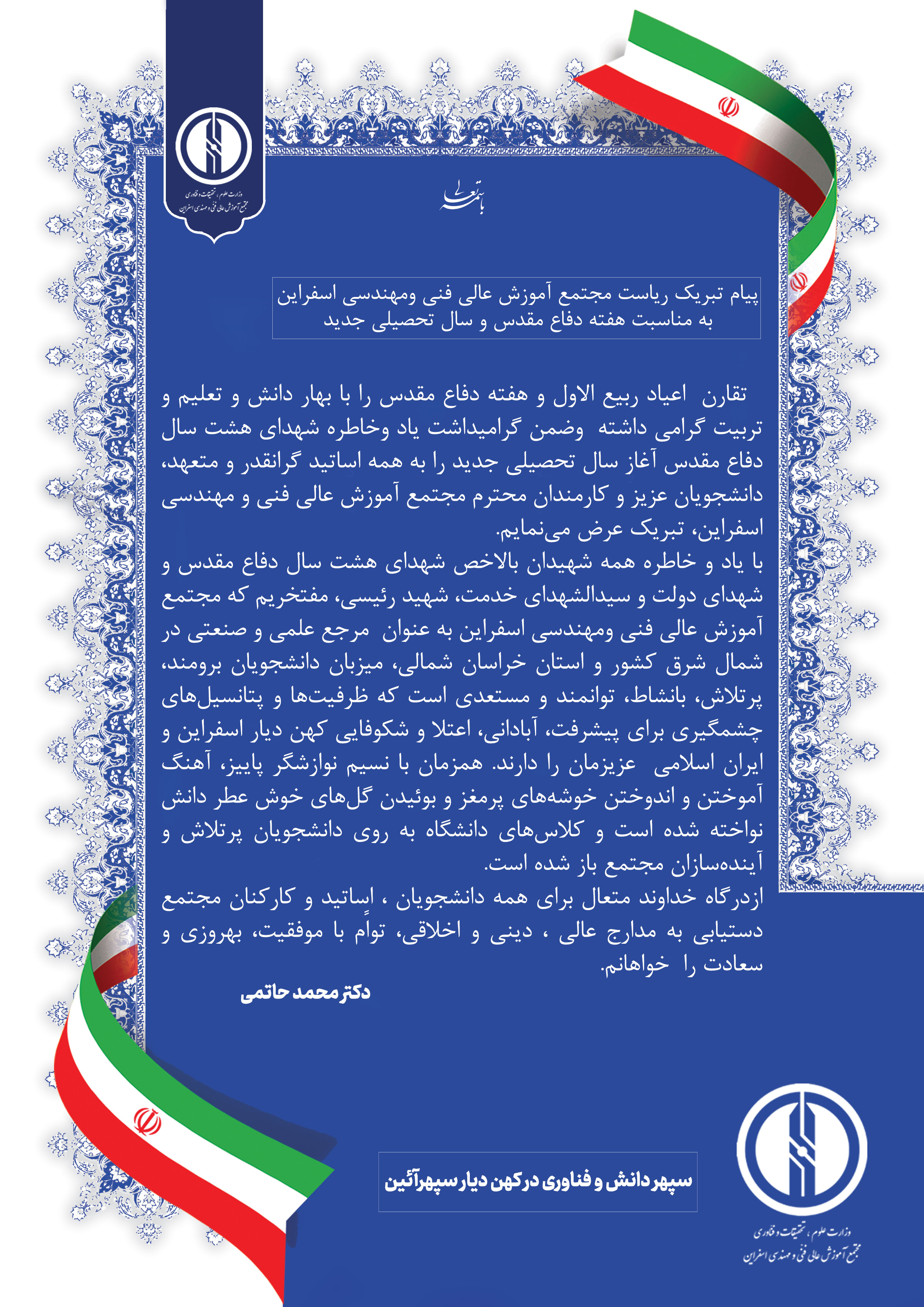 پیام تبریک دکتر محمد حاتمی ریاست مجتمع آموزش عالی فنی ومهندسی اسفراین به مناسبت هفته دفاع مقدس و سال تحصیلی جدید ۲۴ شهریور ۱۴۰۳ | ۱۲:۵۷ کد : ۳۵۷ اخبــــار مجتمع ارسال به دیگران نام شما ایمیل شما ایمیل دریافتکننده ارسال انصراف تعداد بازدید:۳۲۶