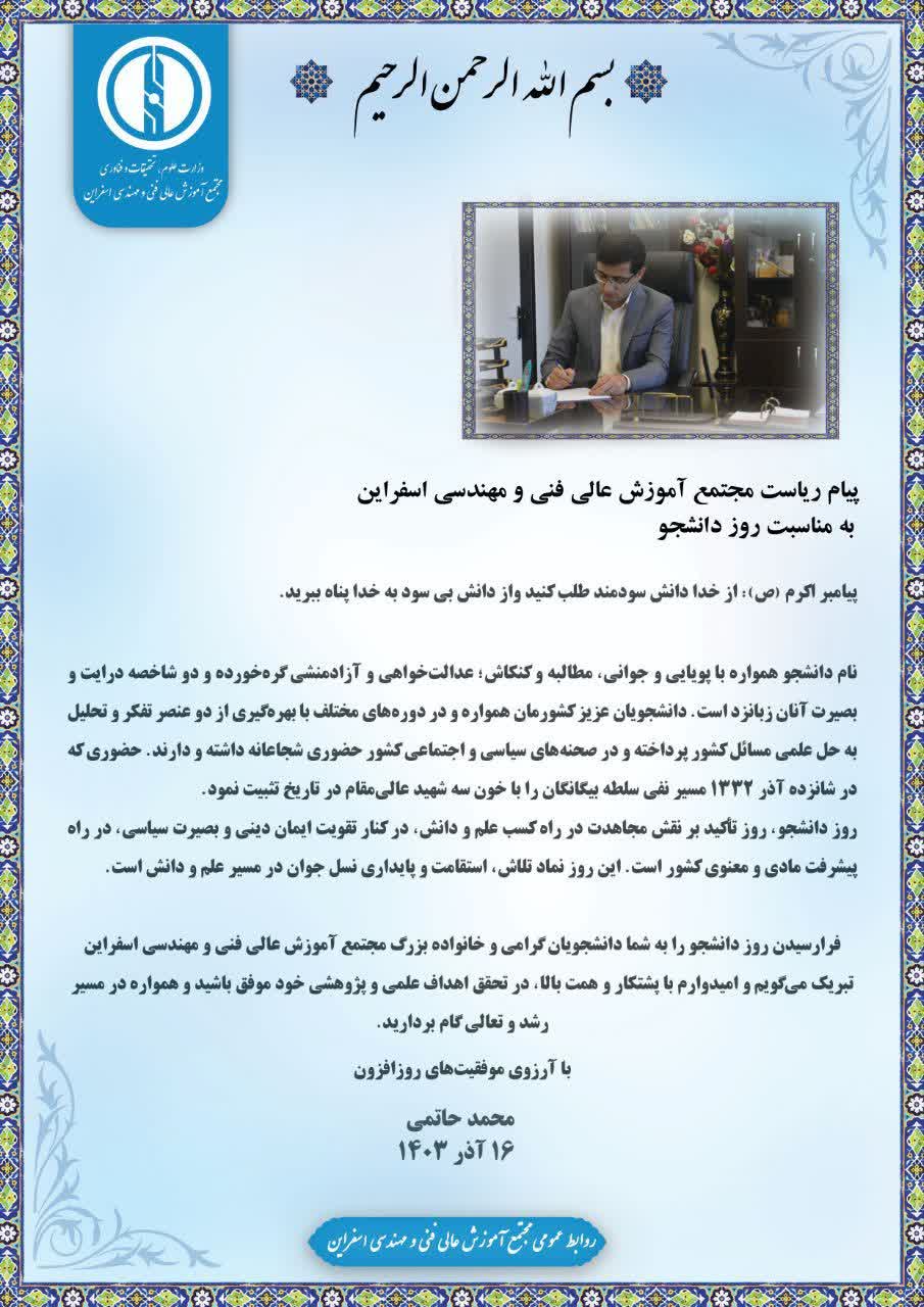 پیام دکتر محمد حاتمی، ریاست محترم مجتمع آموزش عالی فنی و مهندسی اسفراین به مناسبت فرا رسیدن ۱۶ آذر، روز دانشجو ۱۷ آذر ۱۴۰۳ | ۰۹:۵۷ کد : ۴۷۹ اخبــــار مجتمع ارسال به دیگران نام شما ایمیل شما ایمیل دریافتکننده ارسال انصراف تعداد بازدید:۱۹۴