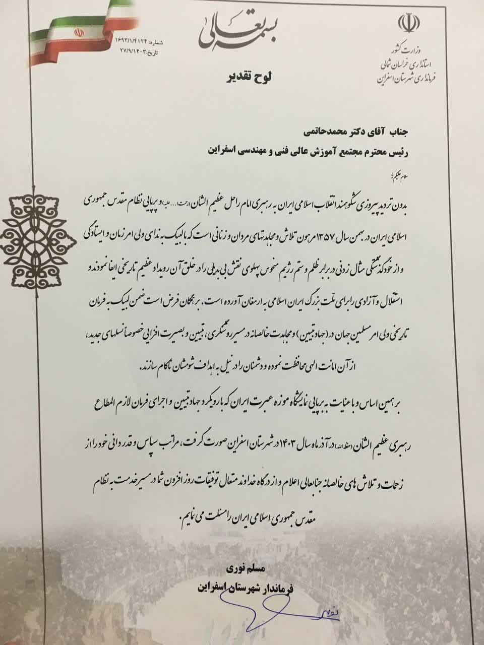 تقدیر و تشکر از مجتمع آموزش عالی فنی و مهندسی اسفراین به جهت همکاری در برپایی نمایشگاه عبرت