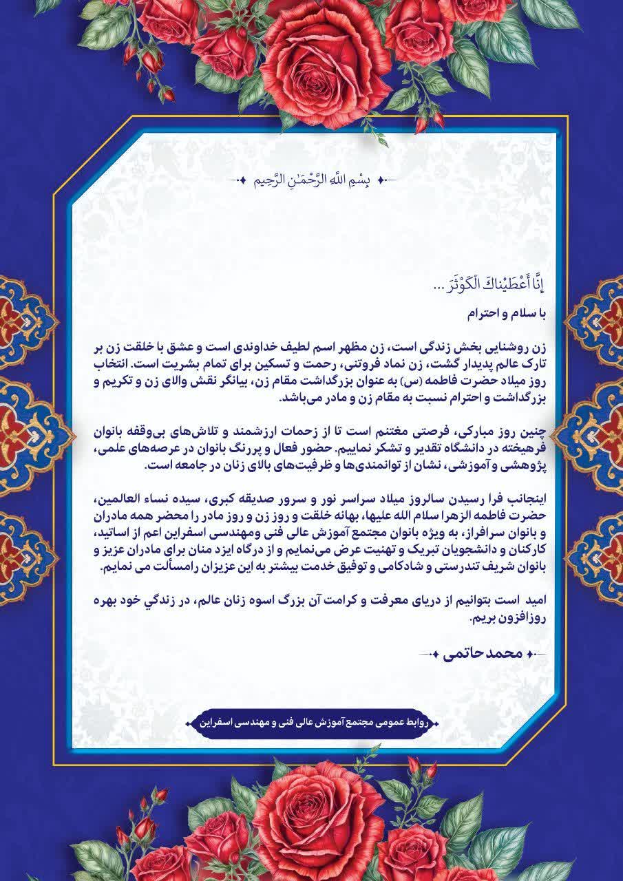 پیام تبریک دکتر محمد حاتمی ریاست مجتمع آموزش عالی فنی و مهندسی اسفراین به مناسبت ولادت حضرت فاطمه زهرا(س)، گرامیداشت روز زن و مقام مادر ۰۴ دی ۱۴۰۳ | ۰۸:۵۲ کد : ۴۹۹ اخبــــار مجتمع ارسال به دیگران نام شما ایمیل شما ایمیل دریافتکننده ارسال انصراف تعداد بازدید:۲۱۸