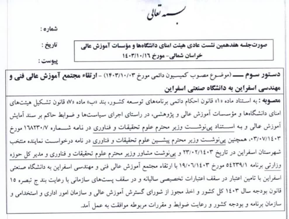 در دستور سوم مصوبات ابلاغی و پیروی پیگیریهای نماینده محترم شهرستان در مجلس شورای اسلامی، ریاست، معاونین و مدیران مجتمع، ارتقای مجتمع به دانشگاه صنعتی اسفراین جهت اجرا و اخذ تاییدیه دفتر گسترش به تصویب رسیده است.