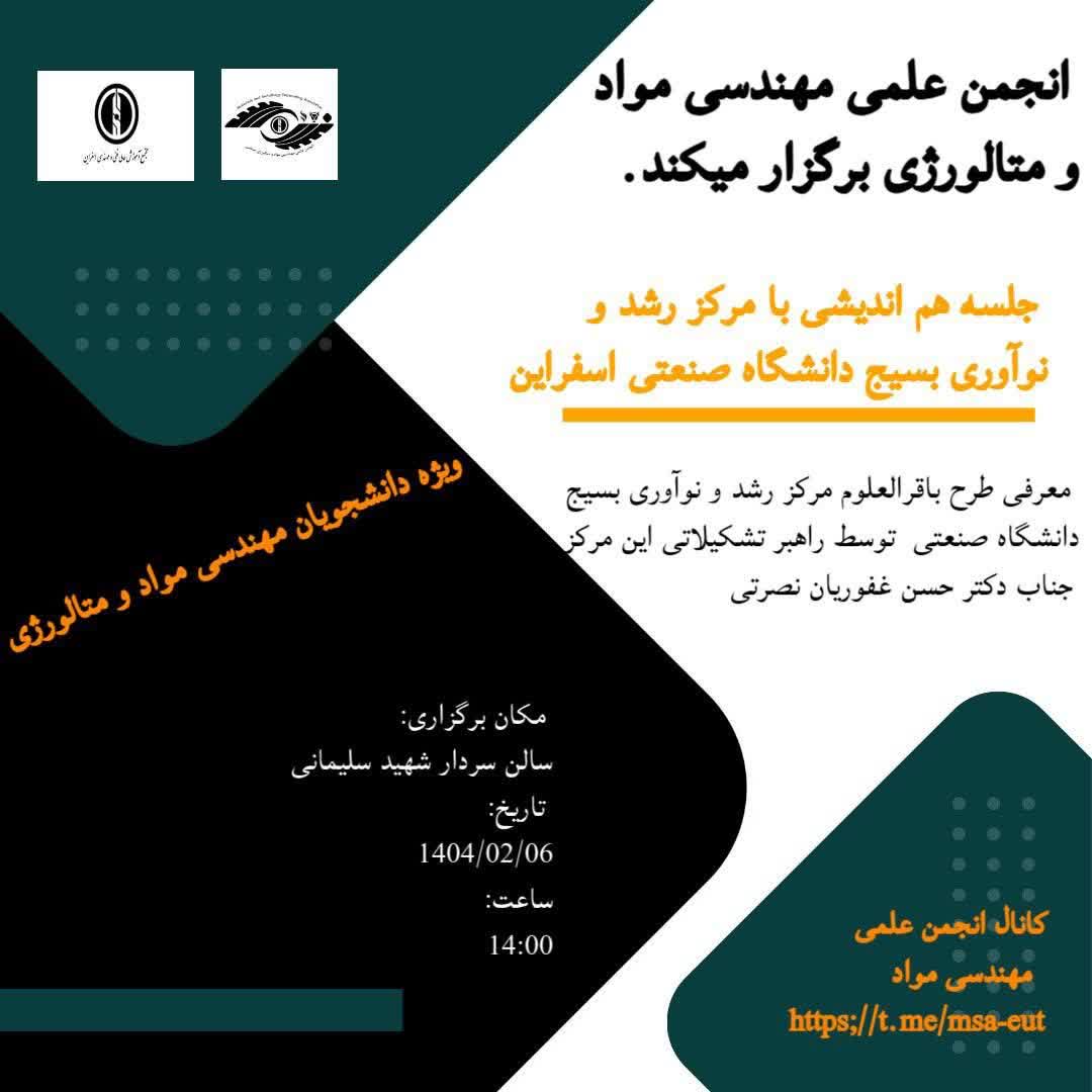 معرفی طرح باقرالعلوم مرکز رشد ونوآوری مجتمع آموزش عالی فنی و مهندسی اسفراین توسط راهبر تشکیلاتی طرح جناب دکتر حسن غفوریان نصرتی برگزار خواهد شد، لذا از دانشجویان مهندسی مواد و متالورژی دعوت میگردد در این جلسه حضور داشته باشند.