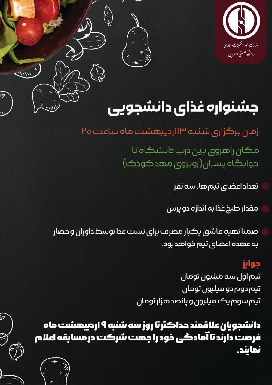دانشجویان علاقمند تا روز سهشنبه ۹ اردیبهشت فرصت دارند تا با مراجعه حضوری به آقای قربانزاده آمادگی خود را جهت شرکت در جشنواره اعلام نمایند.