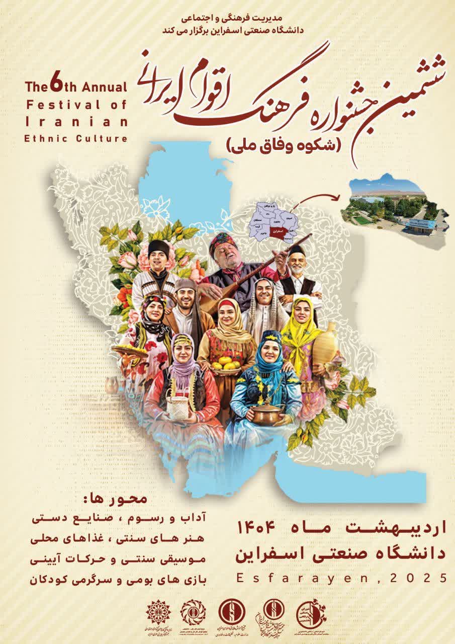 دکتر حسن مسلمی خاطرنشان کرد: ششمین دوره این رویداد فرهنگی در بخشهای صنایعدستی، سوغات، گردشگری، سیاهچادر و عشایر، غذاهای سنتی، بازیهای بومی و محلی و… با حضور دانشجویان استانهای مختلف کشور در حال برنامهریزی و هماهنگی است و ۲۴ لغایت ۲۶ اردبیهشت ماه ۱۴۰۴ در شهرستان اسفراین برگزار خواهد شد.او یادآور شد دانشجویان از استانهای سراسر کشور و همچنین گروههای آیینی از اقوام مختلف کشور در این جشنواره هنر خود را عرضه میکنند.