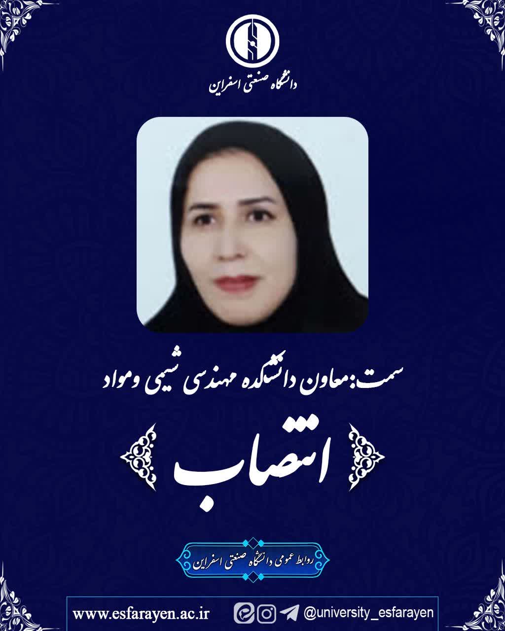 به گزارش روابط عمومی مجتمع آموزش عالی فنی و مهندسی اسفراین، طی حکمی از سوی دکتر محمد حاتمی، ریاست مجتمع آموزش عالی فنی و مهندسی اسفراین، دکتر فاطمه سعید پور به سمت معاونت دانشکده مهندسی شیمی و مواد مجتمع آموزش عالی فنی و مهندسی اسفراین منصوب گردید.