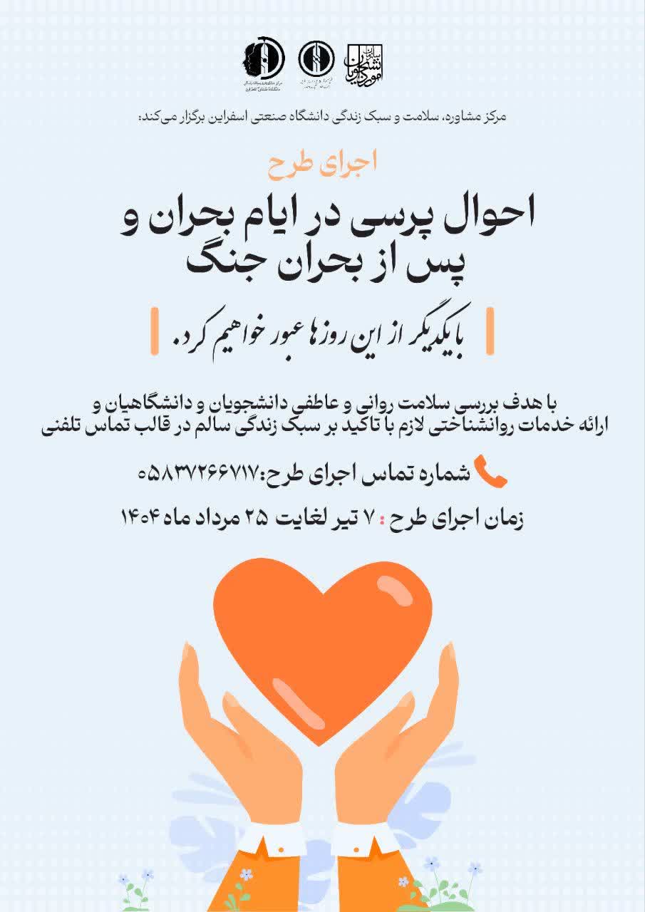 مرکز مشاوره،سلامت و سبک زندگی دانشگاه صنعتی اسفراین با همکاری دفتر مشاوره و سلامت وزارت علوم، اقدام به برگزاری طرح احوالپرسی می نماید:
