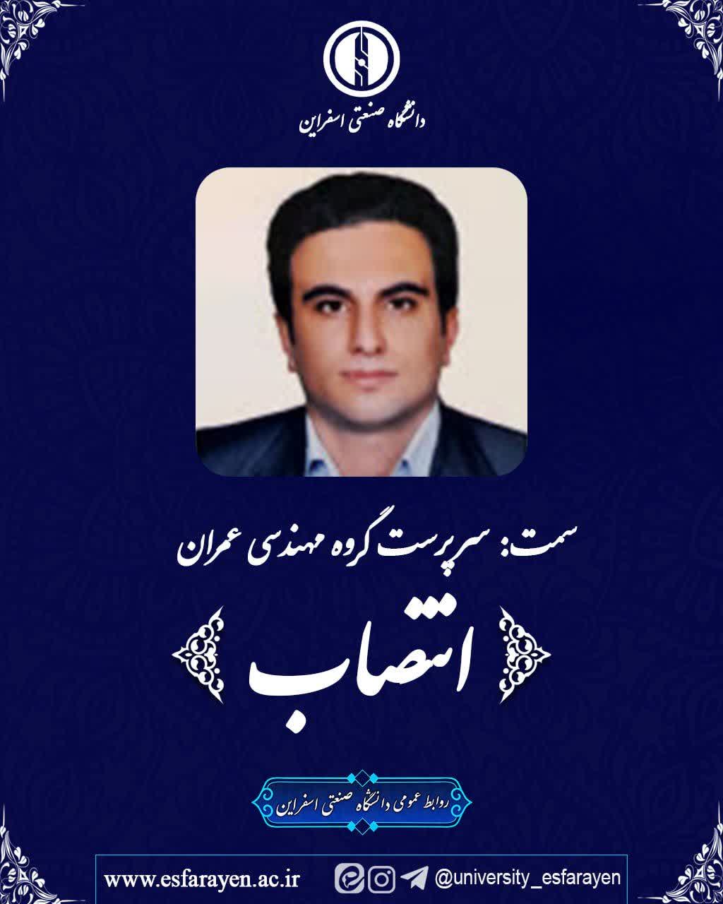 طی حکمی از سوی دکتر محمد حاتمی، ریاست مجتمع آموزش عالی فنی و مهندسی اسفراین، دکتر عادل یونسی عضو هیات علمی مجتمع، به سمت سرپرست گروه مهندسی عمران مجتمع آموزش عالی فنی و مهندسی اسفراین منصوب گردید.