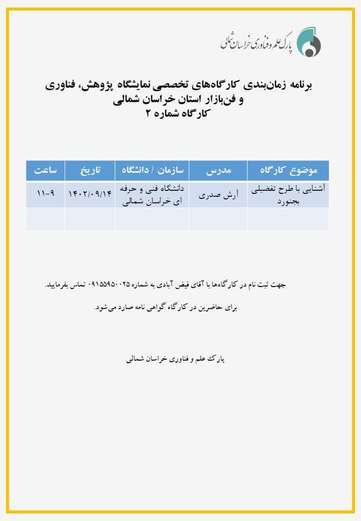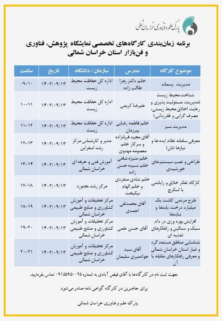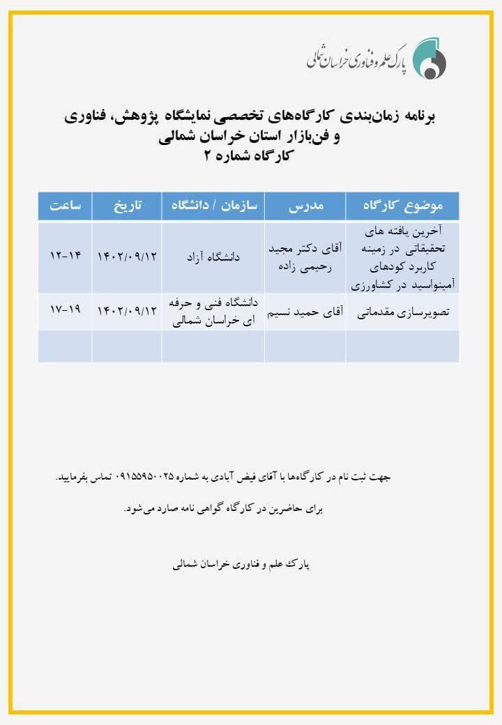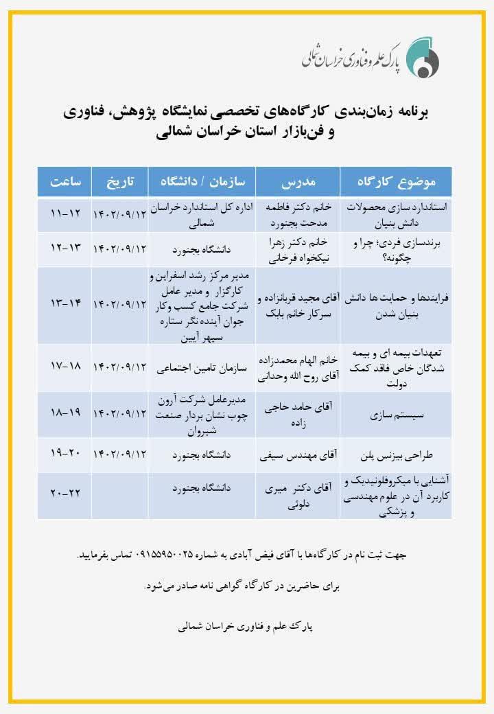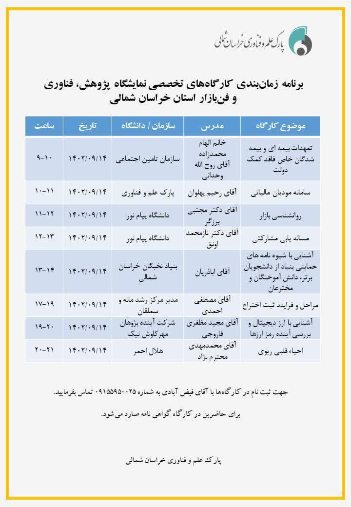 عناوین و زمان بندی برگزاری کارگاه های نمایشگاه دستاوردهای پژوهش، فناوری و فن بازار