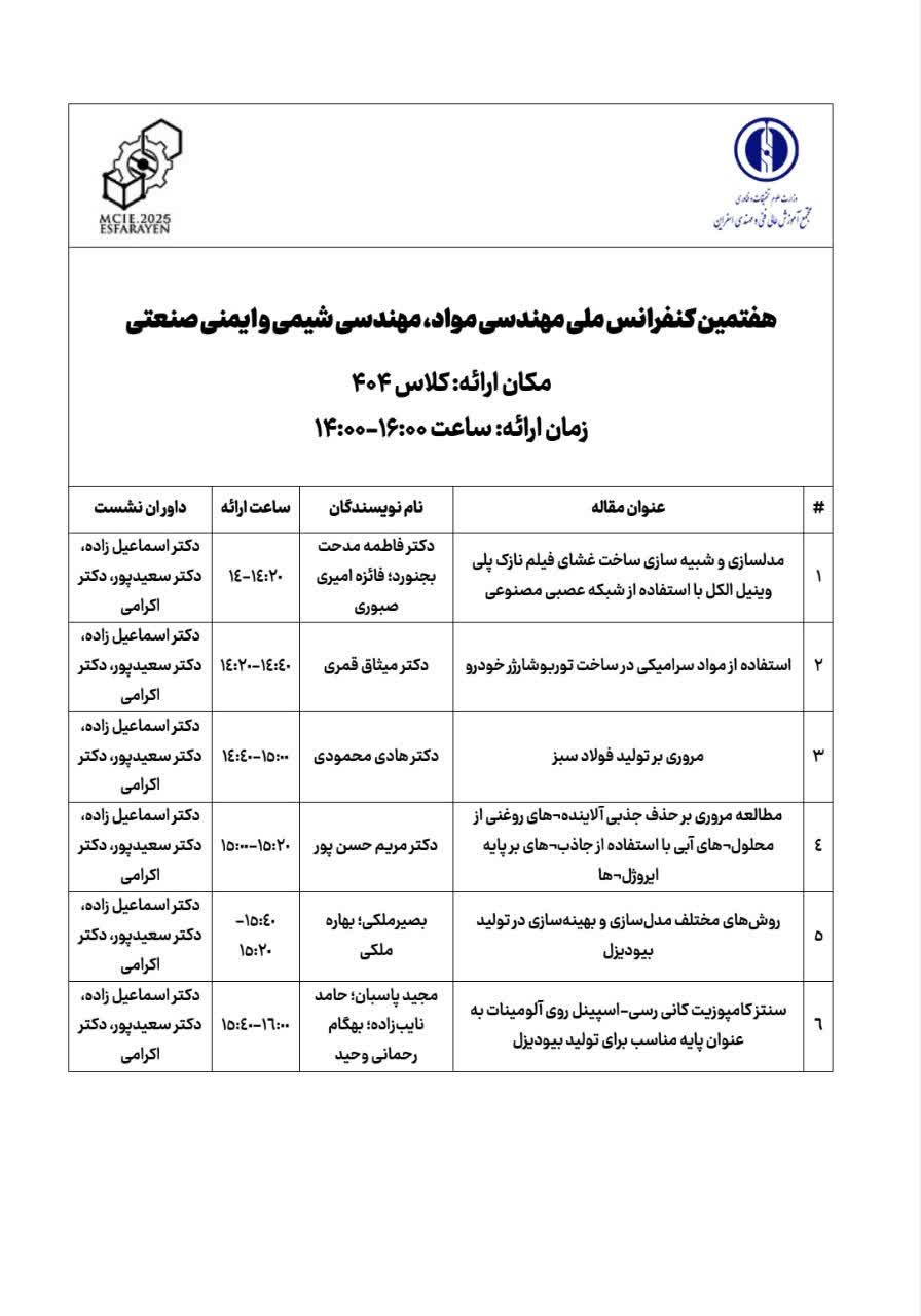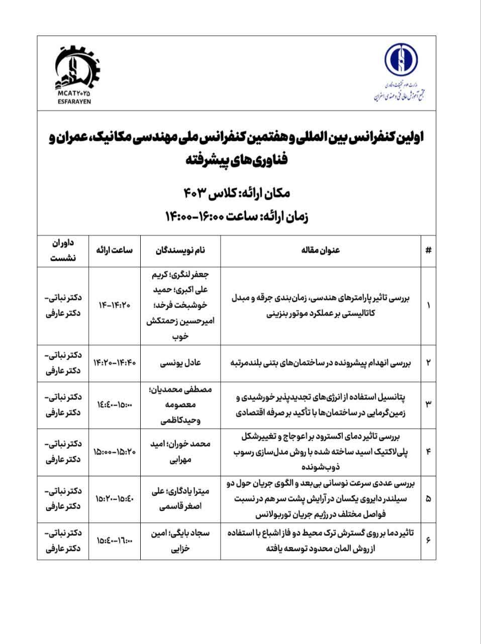 جدول ارائه های حضوری مقالات برگزیده اولین کنفرانس بینالمللی و هفتمین دوره کنفرانسهای ملی سه گانه مجتمع آموزش عالی فنی و مهندسی اسفراین