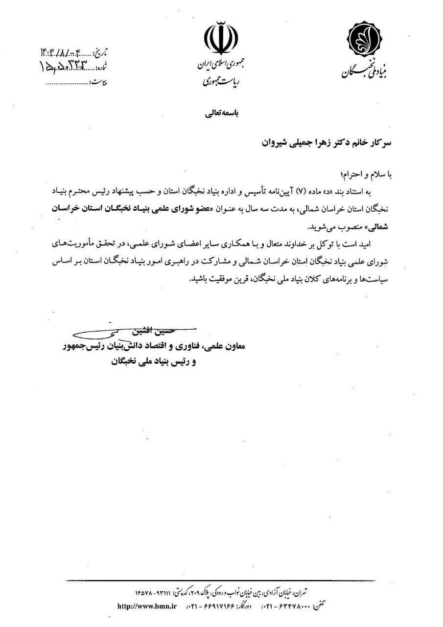 خانم دکتر زهرا جمیلی شیروان، عضو هیأت علمی مجتمع، با حکم ریاست بنیاد ملی نخبگان، به عضویت شورای علمی بنیاد نخبگان استان خراسان شمالی منصوب شدند.